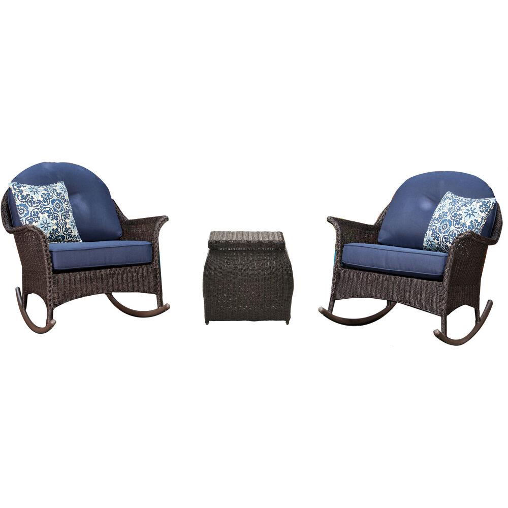 Hanover Sun Porch 3 Piece Wicker Patio Conversation Set With Plush Navy Blue Cushions